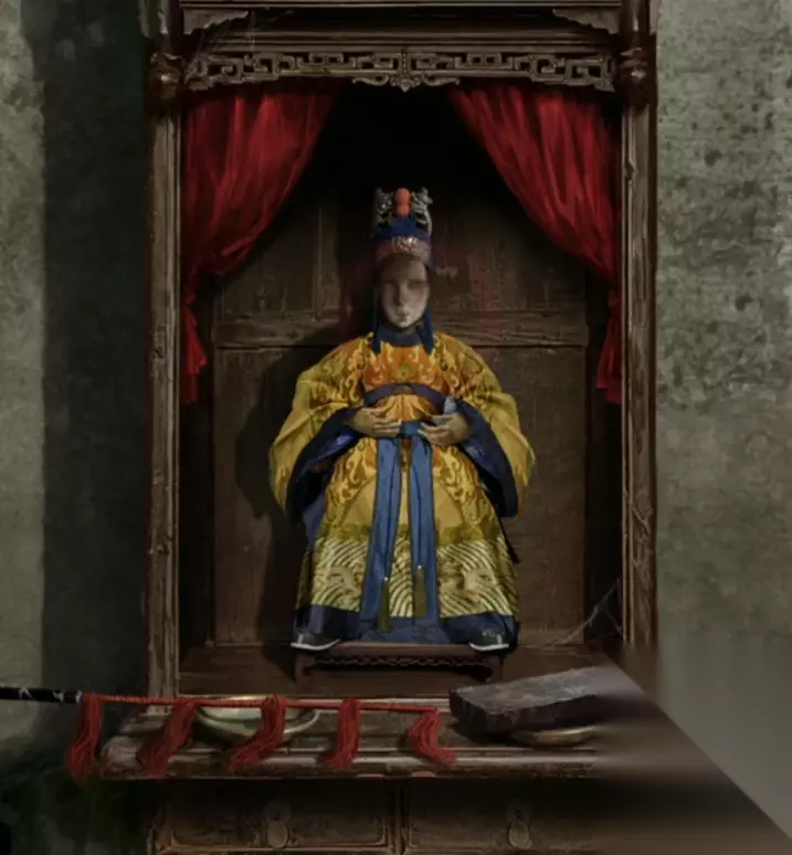 来到右侧房间密室内,在众生皆傀儡的神龛前面放上马鞭(戏曲物品)、磨刀石(木匠工具)、小面具,注意小面具直接戴在雕像脸上即可,戴好后雕像变成了六葬菩萨的样子,来个摸头杀就获得了针。