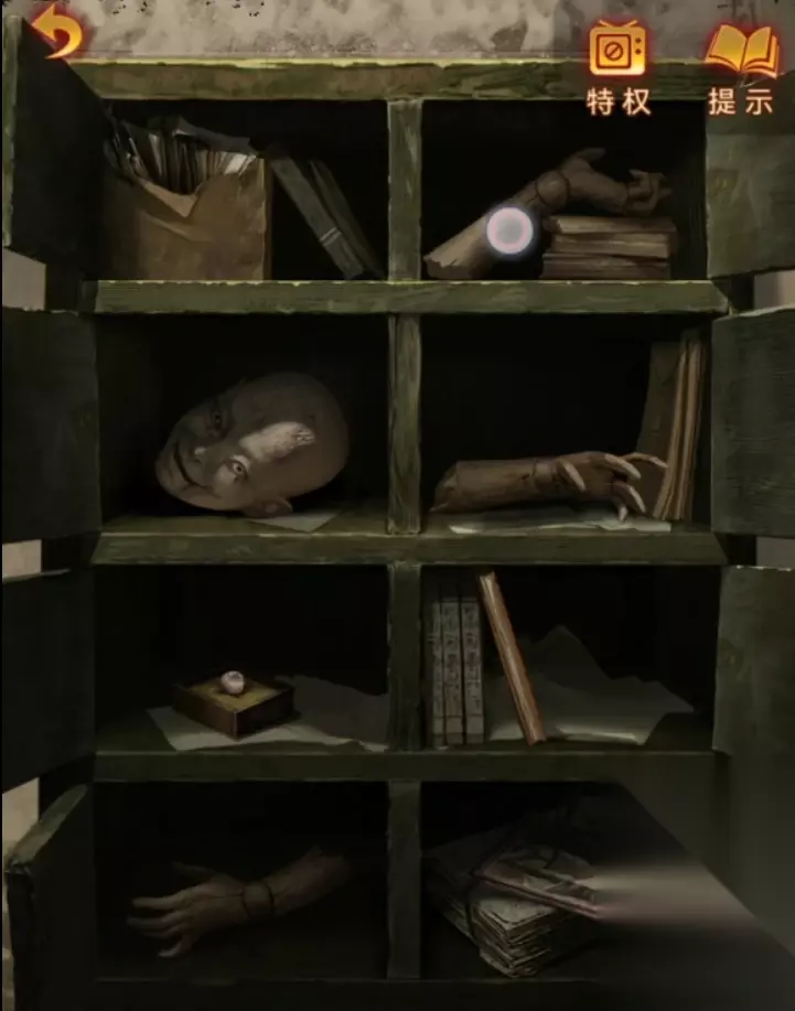 右边的柜子第一层需要个很小的装饰品,第二层是个出剪刀的手,因为他好胜所以我们需要出个拳头让他不愿意输改成布放手。这个房间没有其他线索了后退一下来到客厅,能看到右边本来有个门但是消失了,牌子上安全出口少了个箭头,还有一个挂着有眼无珠木偶的门没有打开。