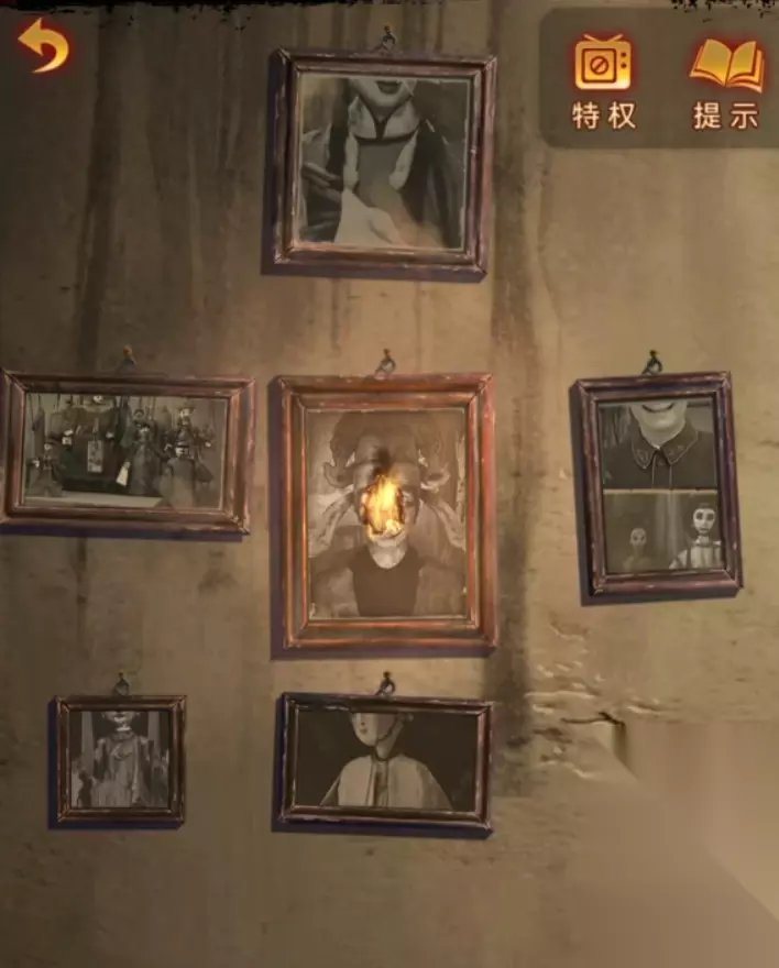 点击缝纫机下面,用刻刀清理掉电源旁边的泥巴,去掉后就能插上电源了,注意在地上的泥巴里面混了个很小的装饰品,回到第一个房间,把小装饰品放在右边架子第一层的奖杯上获得又一张照片,来到客厅把两张照片都放在右边的墙上就可以开始调整了,位置线索在刚刚的日记上,调整为如下后中间照片自燃获得一把钥匙。