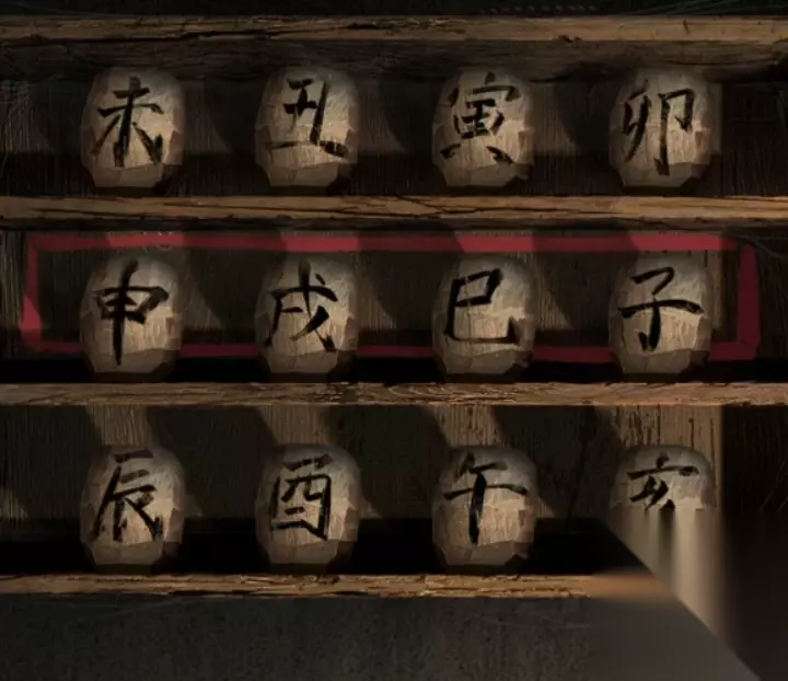 回到有缝纫机的房间,在左侧的墙上有十二地支的木球,中间有一个红框,所以把红框中的调整为申戌巳子后右边的密室就打开了,进入后小高能,唱一半就跑了~捡走右边床上的红盖头,查看左边椅子上的木偶头,木偶头右眼没有完成,拿起刻刀准备好心帮它完善一下,结果刚刚下手刻刀就直接被抢走了,木偶下巴都惊掉了,拿到钥匙。