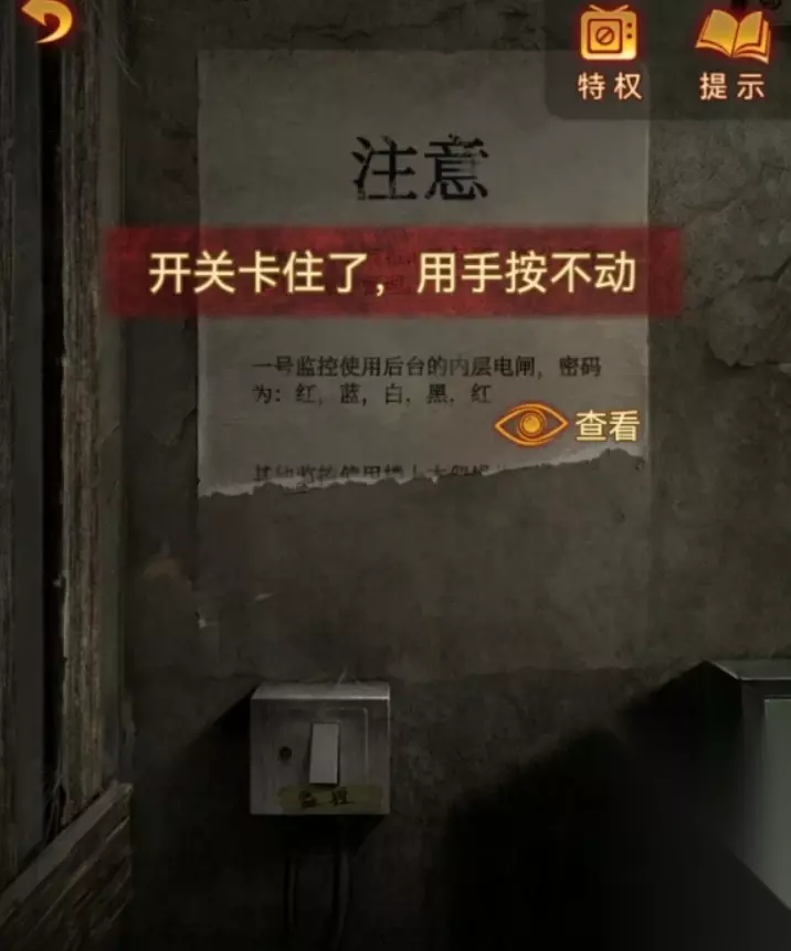 来到左边的房间,用钥匙开门进入监控室,监控室远处的设备都是坏掉的,坏掉的设备左边有个提示密码是红蓝白黑红,很熟悉吧~就是男主那边前面的密码了,下面的开关卡住了,用磨刀石砸一下开关开启监控,此时左下角的监控就可以查看了。