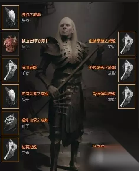 BUILD核心暗金装备:鲜血匠师的胸甲 提供4级骨灵以及捡血球放骨灵的能力,极大提升了对群输出 (有评论区指出该装备附赠的免费骨灵不吃很多增伤,我经过实际测试发现波动范围极其大,从搞钱骨灵的5%-50%都有可能,搞不清楚具体的触发机制) BUILD的传奇装备词缀选择: 武器选择魔杖+幸运一击,易伤 爆伤 白骨爆伤 智力/全属性;头盔选择CDR 精魂上限 减伤/护甲 智力/全属性; 手套选择暴击 回能 幸运一击 受伤暴击 智力/全属性;裤子选择血雾+3 减伤/护甲 条件减伤 全属性 鞋子选择 骨灵+3 移速 击杀移速 智力/全属性 项链选择 骇术+3 伤害增效+3 CDR 移速 减伤/护甲 戒指选择 暴击 爆伤 易伤 幸运一击 精魂上限 护盾选择 CDR 幸运一击 暴击 减伤 BUILD的巅峰盘选择:务必选择骨骼移植+肉食者+死亡气息,其中骨骼移植第一个点出。其他随意。暗影凋零盘就是一拉胯盘 传奇节点算了算真是搞笑的 实际作战也不行。