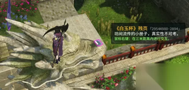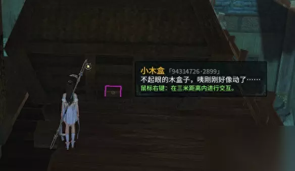 38.小猪快跑(-229,290)*两块突出的石头中间草地上,小盒子 39.白蛟随笔(-166,-319)*墩子上卷轴 40.龙星石(-144,-378)*石头与墙的夹角 41.薄荷叶(-275,-447)*树脚下,与石头相近,开极简 42.蜂巢(-175,-490)*树脚下两个大球里的一个,有掉血BUFF 43.纯净之气(-90,-446)*屋顶的尖尖上,极简看不到 44.错漏琴谱(-38,-520)*屋顶靠石壁那里,两层木板相叠的中间 45.小木盒(269,-330)寻风渡地仓里