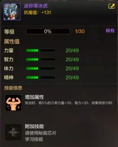 这个宠物可以增加玩家的伤害攻击,主要增加玩家的力量属性效果。 有着131点的抗魔值,在稀有宠物中不推荐玩家选择使用,属性稍微有些差。