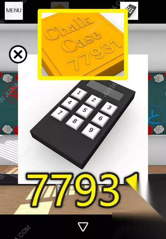 28、最后在道具栏点击粉笔变成粉笔盒,把红色粉笔放入粉笔盒,根据书本上不同颜色的高低,调整粉笔的位置,从左到右为蓝红白黄粉,完成后观察粉笔盒上的数字77931。28 28.1