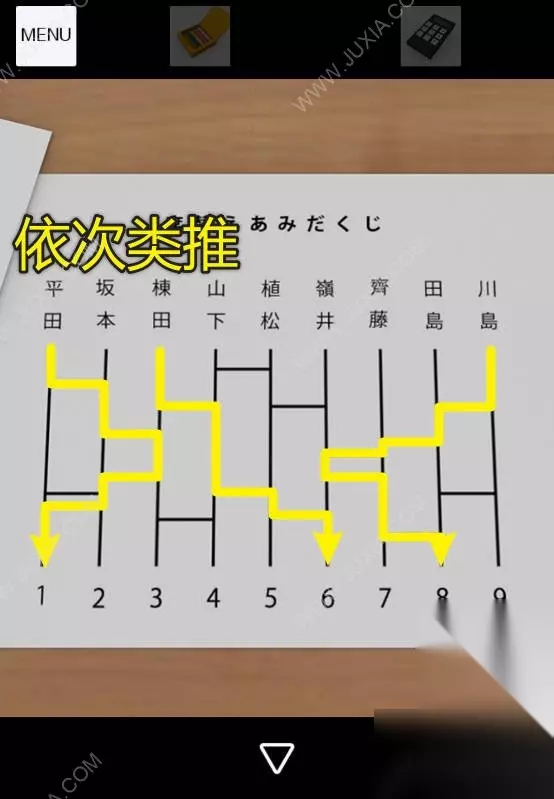 22、观察卷纸下的提示,这个提示的意思是从人名开始,遇到拐弯就拐弯,直到到达下面的数字,那么平田对应1,坂本对应2,栋田对应6,山下对应5,植松对应4,领井对应3,齐藤对应9,田岛对应7,川岛对应8。22