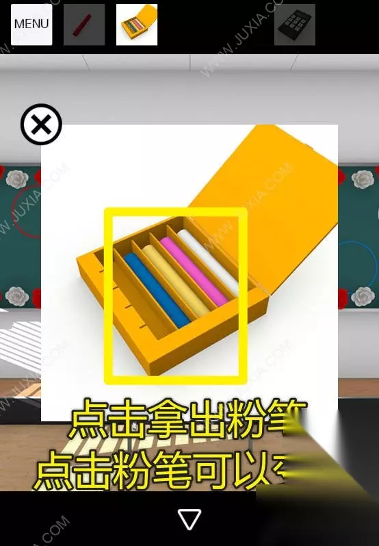 27、点击大黑板,在道具栏点击粉笔盒,点击粉笔盒拿出粉笔,点击粉笔可以变色,对黑板上有颜色的圆圈使用对应颜色的粉笔。27 27.1