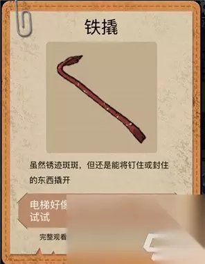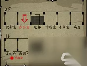 18、回到厕所里面,拿到厕所的镜子,这也是证物之一,用铁撬将电梯上的东西弄掉,点击旁边的按钮打开电梯,到达2楼,可以获得【电梯惊魂】证物。 19、来到诊断室里面,打开里面的书柜。