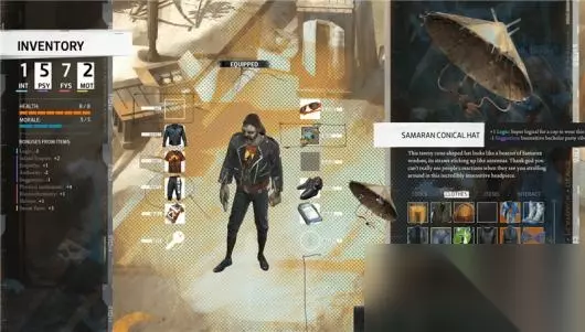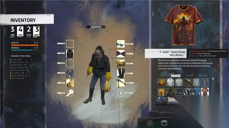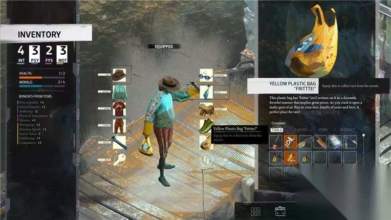 «3456789101112»友情提示:支持键盘左右键"←""→"翻页 2. 道具栏 道具栏中间位置描述了目前角色穿着的服饰。 这些服饰可以为角色提供额外的技能或属性加成,但一些服饰也会降低它们。