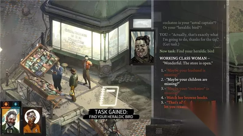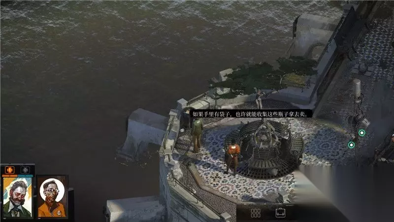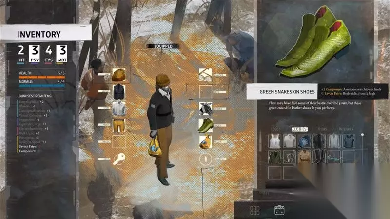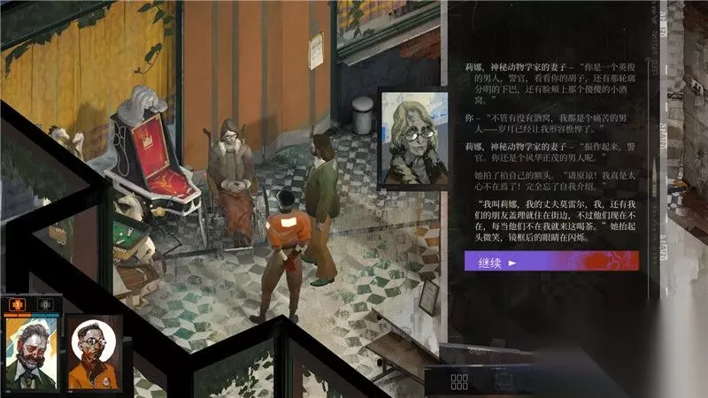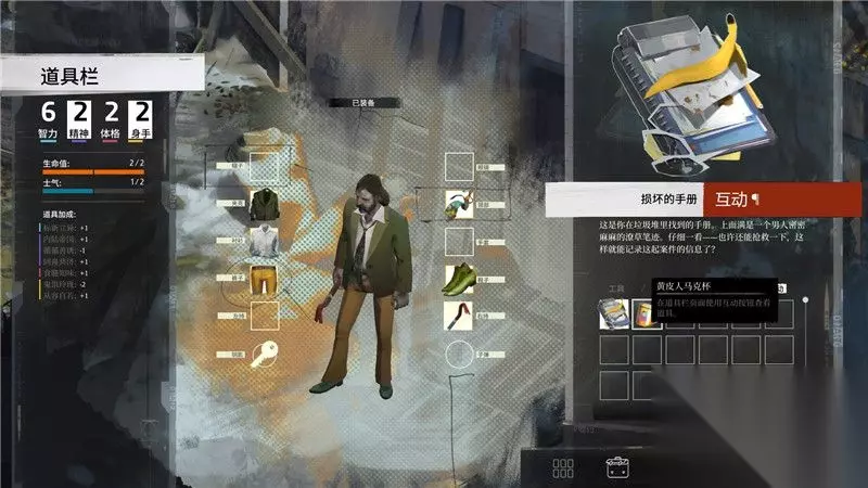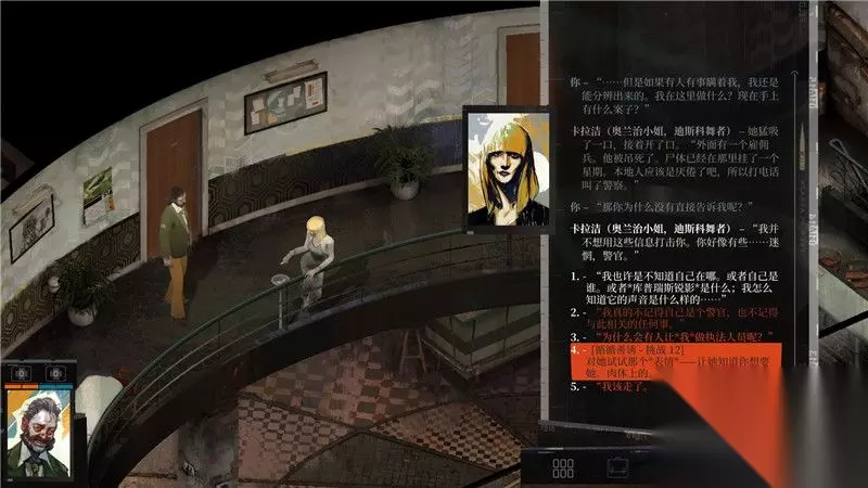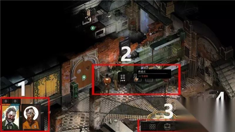 游戏界面解析: 1. 角色与队友 主角相框上方显示有当前角色的生命值和士气值。 2. 主角与互动 主角可以对物品,人物,以及一些其它调查点进行互动。 3. 功能菜单 功能菜单包括角色信息,道具栏,日志和思维阁四大部分。 详情参考游戏系统和玩法篇的内容 4. 时间 时间是游戏中的重要要素。 这个位置显示当前时间和天数。
