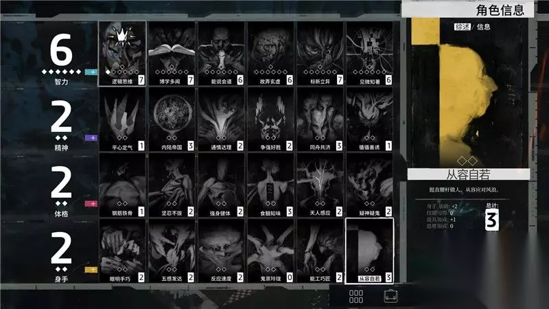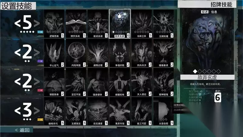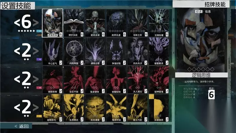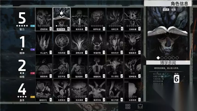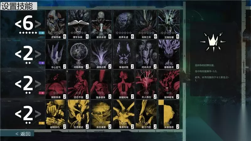 关于这24种技能,你可以在右上角区域翻看它们的“综述”和“信息”。 这些提示和描述有利于你更倾向性的加点。