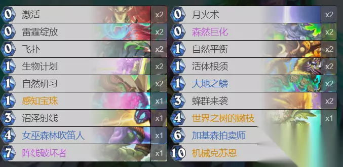 一、千甲德卡组构成分析 在卡组构成方面,这套卡组以德鲁伊本身低费的优质法术作为构成,例如激活,月火术,森然巨化,雷霆绽放,飞扑,生物计划,活体根须,自燃研习。