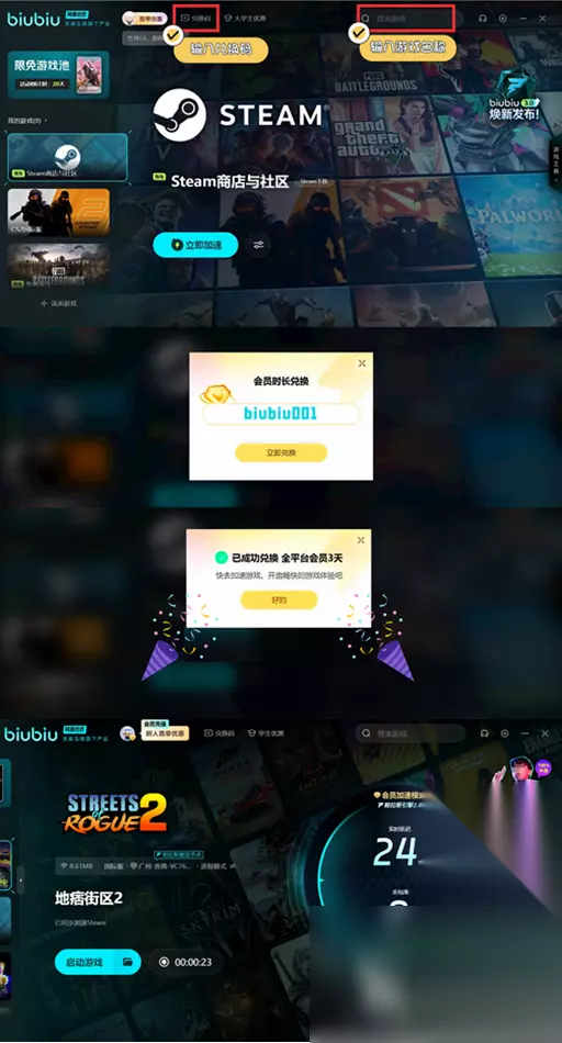 现在还有许多的活动,例如可以获取免费加速时长,如果使用两种方法可以免费长达75小时。新手下载并且注册打开领取3个小时时长。兑换码【biubiu001】还可以领取72小时。