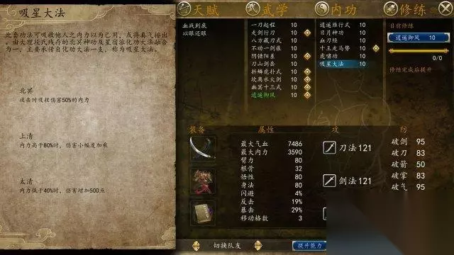 9:连斩必备,吸蓝加攻“吸星大法” 小编语:首先现在攻击力与内力挂钩的情况下,内力+800的吸星大法就等于加了攻击力,另外连斩翻倍的内力损耗需要由吸星大法的吸取内力来补充,你可不想就斩了两个小兵就没蓝砍人吧。 出处:1.偷罗蛇君。南宫龙飞比较麻烦,需要被意乱情迷后然后偷。 2.正经出处:喀什,需要肚痛贴(杜康村支线:杜康村 张帆 送花 任务 选不帮忙 送花 得到 肚痛贴),对话西域卫兵? 3.隐元阁购买 简介:此套功法可吸收他人之内力以为己用,或将真气排出。由大理段氏残存的北冥神功及星宿派化功大法融合为一,主要传承自化功大法一支,成为吸星大法。