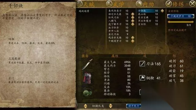 4:暴击还能霸体?就看“千刃决” 小编语: 基础属性增加1000气血加上500内力以及 +1移动。风骚快刀哥龙墨自带内功,效果不错可惜无法获得。本身提升暴击概率,巨门的效果又让其暴击后霸体,配合其他心法加强暴击率后简直无情。可惜属于自带心法暂时没有获得渠道。 获得方法:暂无 简介:点苍派心法,点苍山山景变幻万千,所以其武学也千变万化,令对手捉摸不定。