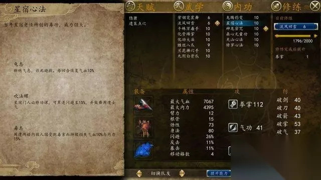5:隐身光环流的核心功法“星宿心法” 小编语:如果侠客前传的敌人们能投票表决哪个功体最烦人,我相信“星宿心法”一定排名靠前,特别是看到紫绫姑娘时,一旦隐匿天赋发动,不见人影只见自己血量蹭蹭往下掉,这能不气人么!卫紫绫专属功体,配合天赋卡位加烫人,简直是磨人的小妖精啊。 获得方法:卫紫绫自带心法 简介:当年星宿老怪所创的毒功,威力强大。