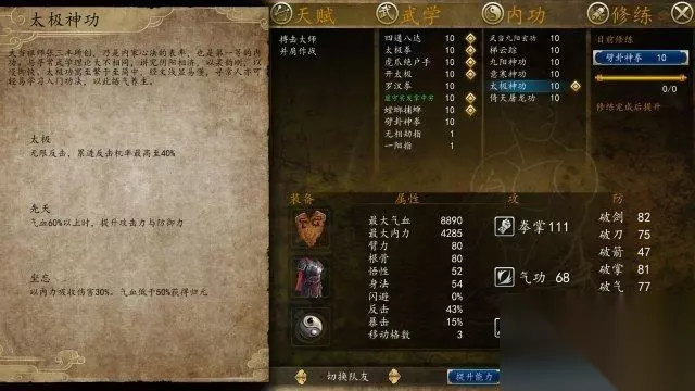 7:天人合一,道法自然“太极神功” 小编语:“太极神功”一眼望去只能说是中规中矩的一门内功,气血以及内力加的都不多,但是内功效果不错“反击”;“攻防提升”;“归元”都是不错的BUFF,而累进40%的反击几率也可以说是不错的反置手段。 获取方式:古实自带的武当九阳玄功练到10重后去武当派右边找他爹古道长对话,选择请教,战胜后即可获取。 简介:武当祖师张三丰所创,乃是内家心法的表率,也是第一等的内功。与寻常武学理论大不相同,讲究阴阳相济,以柔韵刚,以慢御快。太极功寓至繁与至简中,经文浅显易懂,寻常人亦可轻易学习入门功法,以此练气养生。