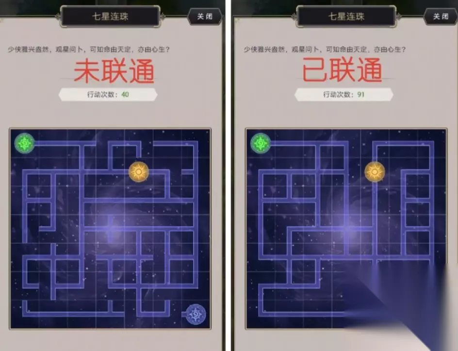 上面两个NPC是玩小游戏的,左边是七星连珠,右边是诸葛锁 下面这个NPC是购买游戏门票,兑换升级道具的:每天可黄金购买4个命盘石,玉璧购买9个 游戏玩法如下: 1.七星连珠,点亮所有黑暗的格子后,通过旋转方格连接所有的通道,不能有空口断口,其中“日”格可以一次性点亮周围8格迷雾,“月”格不可移动(作为联通标准)。