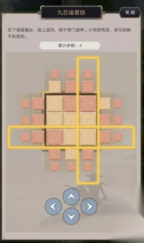 技巧是有的,比如贴边的“两口”格只能横向摆放,“十字”格无须旋转且周围四个必有对应,起终点两个格子也可以旋转,对自己不自信的可以拿小号练练手,很容易就能理解了 五星连珠最高200分,16道具 七星连珠最高200分,20道具 2.诸葛锁,选定一行或一列,将所有亮色方格移动到中间通关。 要点就是选定的那一列或者那一行会同步移动,注意预留提前量,也可以先把会被影响的那一行其他格子放在外面不受影响,再移动 四芯锁很简单不赘述