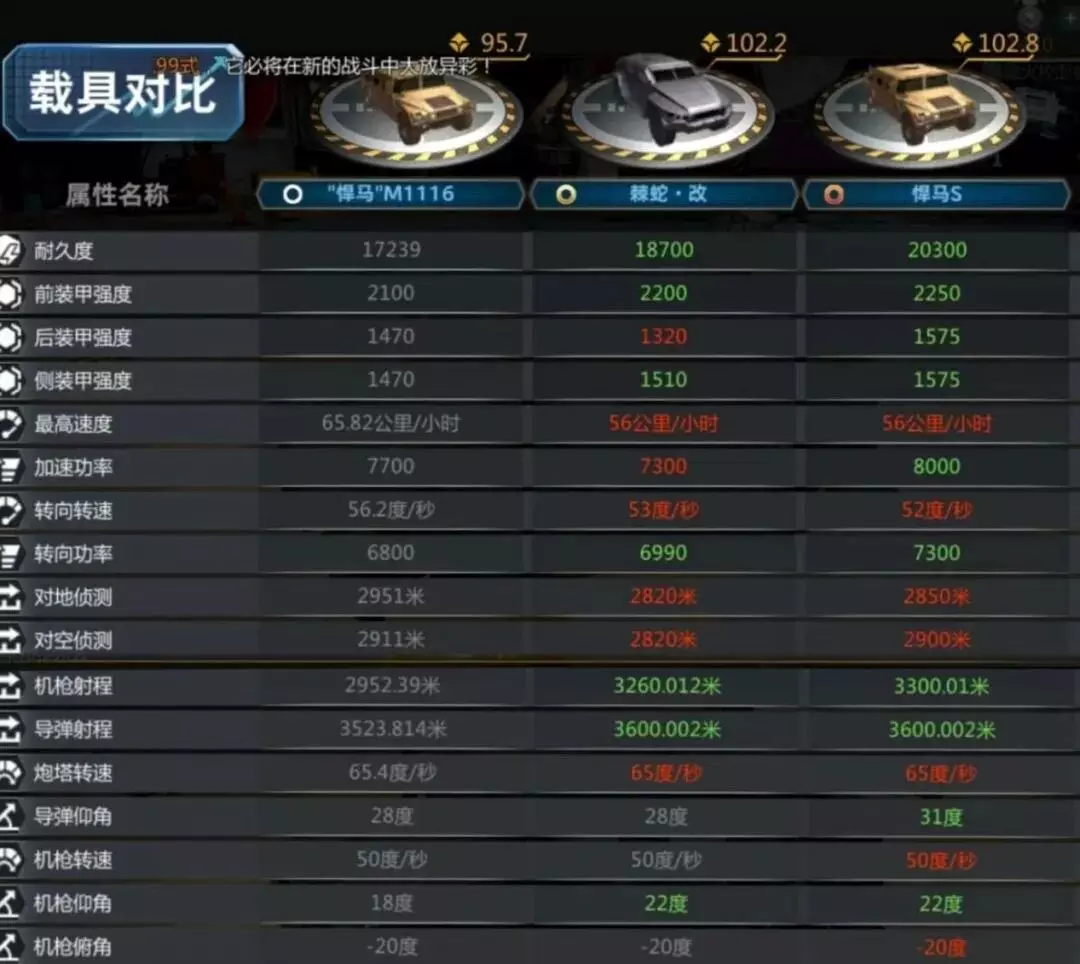 由于第一行载具数据有误,我们暂时用悍马M1116作为参考,下同。