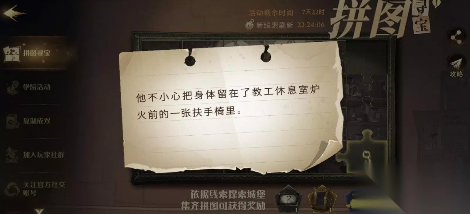 拼图攻略3 拼图线索3:他不小心把身体留在了教工休息室炉火前的一张扶手椅里。