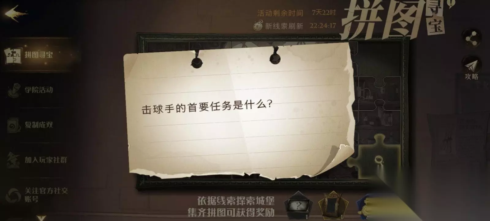 《哈利波特:魔法觉醒》拼图寻宝活动第三期第七天攻略介绍 拼图攻略1 拼图线索1:击球手的首要任务是什么?