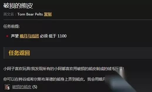 任务前提: 暗月马戏团声望值低于1100 任务需求: 5张破损的熊皮 任务奖励: 4张暗月马戏团奖券