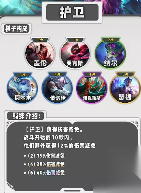 7、擎天卫 获得护甲和魔抗,当该羁绊的单位死亡后最近的单位将获得额外的护甲和魔抗。