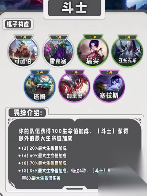 二、新增职业类羁绊一览 1、斗士 获得生命值加成,队伍的其他人获得100生命值加成。