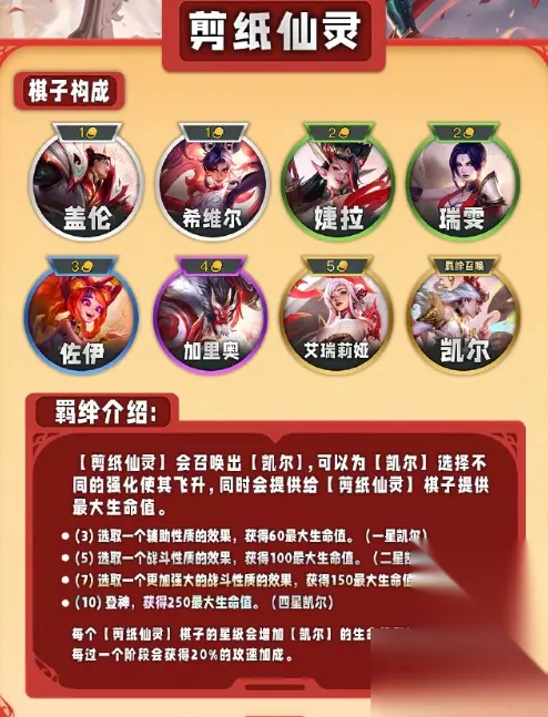 云顶之弈s11羁绊一览表 一、新增特质类羁绊一览 1、剪纸仙灵 召唤凯尔,剪纸仙灵获得最大生命值,当剪纸仙灵的星级增加时增加凯尔的生命和法强。