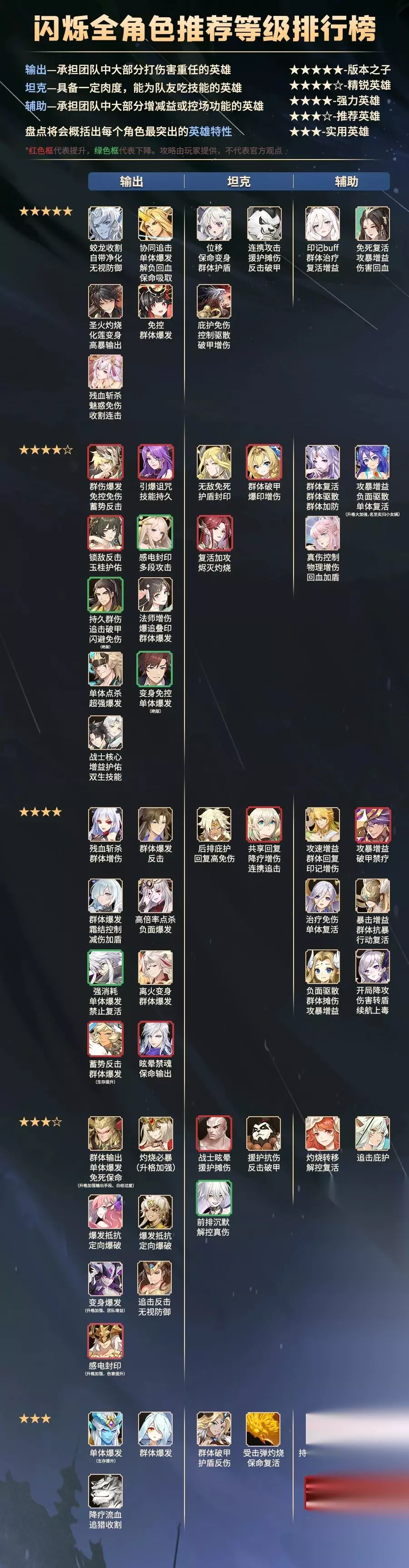 *本榜为后期英雄强度排行,红框为新上榜或升级,绿框为降级,黑框等级不变 *韩立、白小纯、莫凡(联动后)不可获取;魔械师未纳入统计 *本图内容适用于2023年11月9日版本 输出英雄解读 ◆ 5星推荐英雄都具有强劲的持续输出能力,能够长时间打出稳定伤害;同时对阵容的要求较低,可以跟很多英雄形成搭配。 ◆ 4.5星推荐是输出英雄中的佼佼者,各自身怀效果不俗的输出绝活,能够撑得起一套主流阵容的输出重任;或是在补足输出方面具备难以取代的作用。 ◆ 4星推荐在合理的搭配中也能够担当起输出大任,更适合新手或普通玩家。但需要注意阵容配置与稳定性。 ◆ 3.5星推荐等级的英雄都有一定的特色,在特定的场合或搭配中也是能够大放异彩的。 ◆ 3星推荐英雄可在过渡阶段一用。 坦克英雄解读 ◆ 5星推荐坦克几乎在所有阵容中都不必担心失业问题,在承担扛伤重任的同时也能起到一定控场&输出&增益作用。 ◆ 4.5星推荐是通用性和功能性兼具的坦克,略逊5星英雄坦克,但也可在主流阵容中提供有效帮助。 ◆ 4星推荐的坦克拥有非常强的英雄特色,在特定和搭配的情况下能够发挥作用,提升阵容上下限。 ◆ 3.5/3星推荐能保证肉度,且非常容易获取,作为过渡期和新手期的选择非常不错。 辅助英雄解读 ◆ 通用性和功能性超强的5星辅助,适用于所有阵容提供增益+治疗帮助。 ◆ 4.5星是能够适应版本,在增益或治疗方面至少有一个独特优势,同时具备一定通用性的辅助。 ◆ 4星辅助能在适合自己的阵容里发挥功能性,展示自身特色,甚至起到改变战局的作用。 ◆ 3.5星辅助是通用性受限,但在特定阵容和搭配中是顶住局势的合格辅助。 ◆ 3星推荐英雄可在过渡阶段一用。