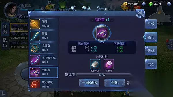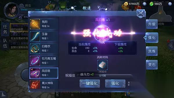 选好要升级的装备,点“自动添加”,背包里绿、蓝品质的装备就会自动放到升级材料栏里,然后点击“升级”即可。如果想快速升级一件装备,选中装备,再点“一键升级”即可。只要背包里的装备足够,就能自动将这件装备升到现在的最高级。 另外,如果换装备,新装备会自动继承原装备的等级。所以有多余装备的时候,放心升级就对了,绝不会浪费! 装备强化 装备强化可以百分比提升装备属性。相比装备升级,强化对战力的影响更为显著。 和装备等级一样,强化等级也是可以自动继承的。 强化操作在锻造界面的“强化”页面里进行。 目前装备最高强化等级是15级。 强化4级以下,使用的材料是精铁,剧情副本会产出不少。