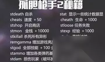 孤胆枪手2秘籍大全 1、cheats:速度加50。 2、cheath:生命加100。 3、stmon:金钱加10000。 4、stexp:经验加1000。 5、stgod:全部技能加100,金钱加50000。 6、stammo:增加各类弹药基数。 7、stshop:开启商店。