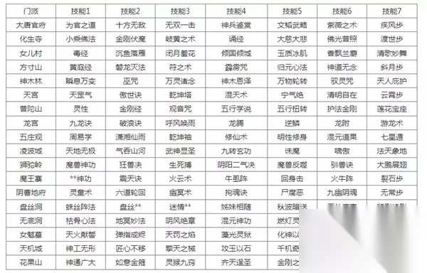 一、转门派技能对照表