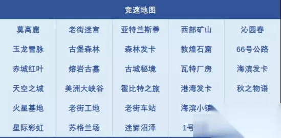 竞速地图:莫高窟、老街迷宫、亚特兰蒂斯、西部矿山、沁园春、玉龙雪脉、古堡森林、深林发卡、敦煌石窟、66号公路、赤城红叶、熔岩古墓、古城秘境、瓦特厂房、海滨发卡、天空之城、美洲大峡谷、霍比特之旅、港湾发卡、秋之物语、火星基地、老街工地、老街车站、海滨小镇、电音之都、星际彩虹、苏格兰场、迷雾沼泽、1号公路、神隐之国