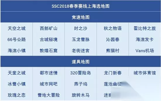 竞速地图:天空之城、西部矿山、时之沙、秋之物语、霍比特之旅、66号公路、古城秘境、玉龙雪脉、沁园春、海滨发卡、海滨小镇、敦煌石窟、老街迷宫、熊猫村、Vans机场 道具地图:天空之城、都市迷情、320冒险岛、龙门新春、城市体育馆、冰雪小镇、城市网吧、燕子坞、莲池幽径、我们恋爱吧、玫瑰之恋、雪地大冒险、旋转木马、迷雾沼泽、猴园春色 SSC2018春季赛线下分站决赛/季度总决赛地图