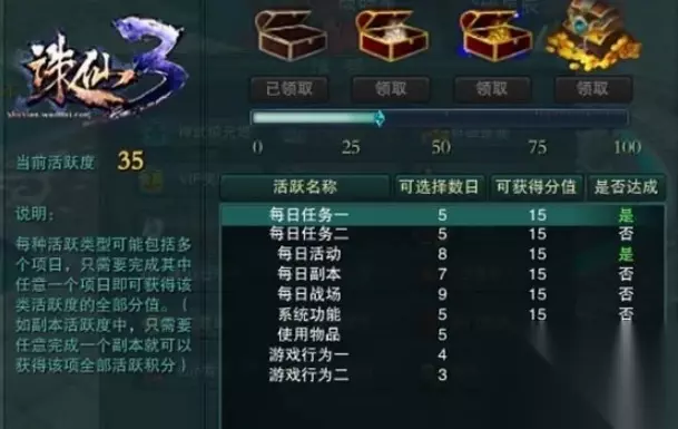 2、每日任务: 每天任务全部完成后,一般活跃度也就达到最高,活跃度可以领取一定的奖励(点击右上角小地图上方的设置,点击设置后,会出现一个新的对话框,在对话框中选择活跃度,之后可以看到完成哪些任务可以获得活跃度),活跃度一共有四个奖励,分别是25-50-75-100四个奖励,分别完成对应的活跃度便可以获得相应的奖励。