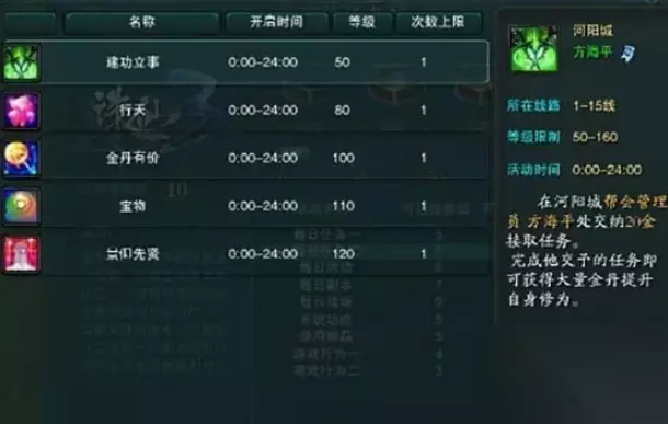 3、日常任务: 日常任务中的点石成金,小虎回家,仙家座机,走失的灵兽等等日常任务获得的经验都是非常可观的,每日完成相应的日常任务也可以获得可观的经验值。(日常任务相对来说比较简单,可以说非常简单,所以不需要太高的操作就可以完成,但是会耗费相应的时间,所以根据自己的时间来安排是否完成)