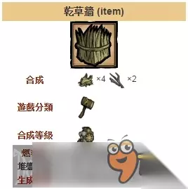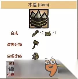 草墙是最弱的墙,是可以被建造,可以被破坏并且可以用来阻挡玩家和怪物的行动的建筑单位。一旦被建造,就可以使用另一草墙或足够的干草来维修或者升级到下一级的草墙(拥有更多的生命值)。草墙可以被攻击并破坏,留下破损的草墙。使用锤子摧毁二级的草墙可以得到两个干草,摧毁其他级别的草墙可以得到一个干草。木墙最高生命值是100,初始状态是50。草墙高度易燃,在草墙边与火狗战斗或者在ROG进入夏天时应当特别注意。草墙燃烧后掉落灰烬。 木墙