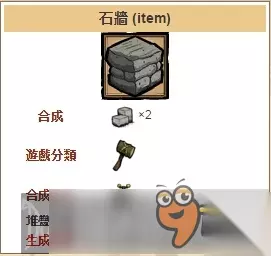 石墙是游戏中第二坚固的墙,在图勒墙之下。是可以被建造、被破坏并且可以用来阻档玩家和怪物的行动的建筑单位。石墙刚被建造时是二级阶段,可被修理或升级成第三或第四阶段,需要的材料是圆石或石砖。当被攻击时会降阶或被破坏,在原址留下一个被破坏的石墙遗迹。用锤子破坏第四阶的石墙可以获得两个圆石,至于其他阶段则是一个。石墙刚被建造时有200血量,最高可到400。修理时,用石头修理的墙会比用石砖修理的墙更加脆弱。用六个石头修理的墙比用一个石砖修理的墙来得弱,而制造一个石砖正需要六个圆石。 同样,使用石砖来修复墙壁比用石墙修复更弱一些。另外,完整的修复被完全破坏的石墙比用锤子破坏石墙和重新建造的花费更高。根据修复的功能,当他们完全的被破坏,需要花费8或9个石墙来完整的修复石墙至最高等级。 图勒墙