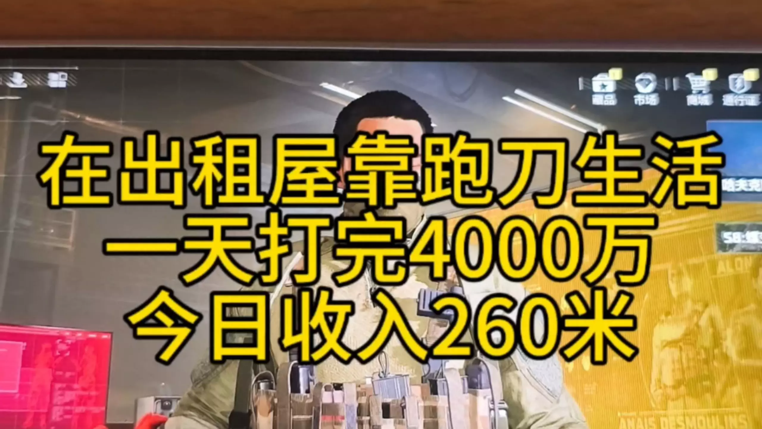 这是一则出租屋游戏搬砖的生活记录,博主通过在游戏里跑刀,一天打出5300万游戏资产,当日变现收入344元,还展示了游戏内的装备资产和自己简单的午餐。