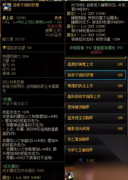 在《DNF》110级版本中,百折不挠的梦想武器皮甲上衣位置,冒险家名望748,属性Lv之和超过Lv240时,增加1%的技能攻击力,每增加Lv40时,额外增加1%的技能攻击力。 《DNF》105级百折不挠的梦想装备属性 百折不挠的梦想 级别:史诗 1.增加属性 增加物理防御力3194 增加力量151 增加智力151 增加体力100 增加精神156 技能攻击力+12% 该装备的属性Lv之和每增加Lv40时,增加3%的技能攻击力。 -穿戴神话装备时不生效。 -上衣、手镯、耳环中仅适用数值最高的1件。 该属性Lv之和超过Lv240时,额外增加1%的技能攻击力。 -该属性Lv之和每增加Lv40时,额外增加1%技能攻击力。 -穿戴Lv00以下装备时不适用。 2.成长属性 成长属性总攻击强化5066。 属性1-Lv1(EXP 0.00%) HP为0时,自身进入睡眠状态,并恢复10%的HP。 属性2-Lv1(EXP 0.00%) 睡眠期间,受到伤害不会醒来。 睡眠状态下,被击时恢复15%的HP。 属性3-Lv1(EXP 0.00%) 每分钟恢复460.2点HP.。 属性4-Lv1(EXP 0.00%) 被破招攻击时,所受伤害-20%。 属性图: