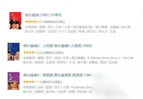 《倩女幽魂》三部曲的豆瓣评分整体保持在了8.0的高水平上,之后的各种翻拍均脱离不了这个版本的影子,今年刚刚上映不久的《倩女幽魂:人间情》更是扑的一塌糊涂。