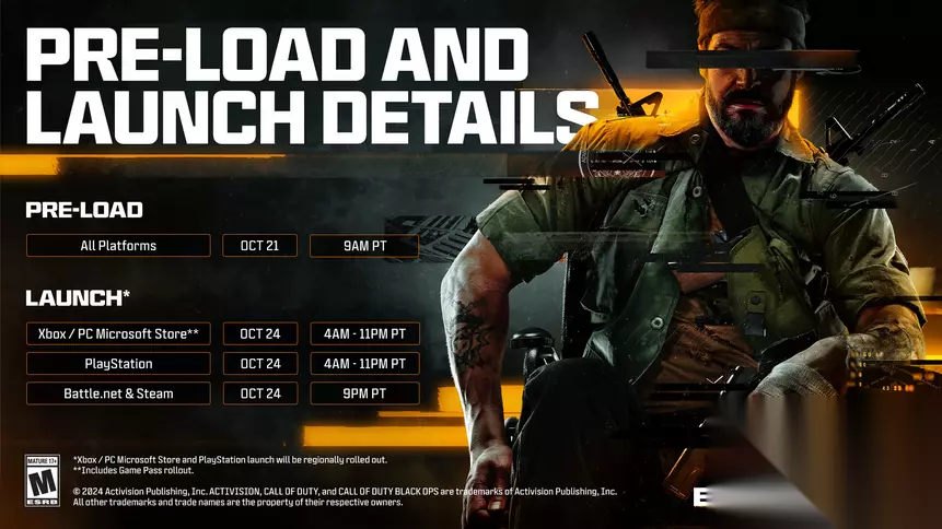 动视今日公布了《使命召唤:黑色行动 6》的预载及解锁时间,并公布了游戏的 PC 配置要求。玩家可以从太平洋时间2024年10月21日上午9点开始进行预载,即北京时间10月22日凌晨0点。对于Xbox和微软商店(包括XGP)版本,游戏将于太平洋时间10月24日下午4点至晚上11点之间逐步解锁;而Battle.net及Steam版本则将在太平洋时间10月24日晚上9点(北京时间10月25日早上11点)正式解锁。 根据官方公布的配置需求,最低配置需要8GB内存和Windows 10及以上版本,并推荐使用NVIDIA 1080 Ti或3060显卡。动视官方还提醒玩家更新显卡驱动以确保最佳的游戏体验,不同品牌显卡的推荐驱动版本如下:AMD - 24.8.1、NVIDIA - 560.70、INTEL - 32.0.101.5972