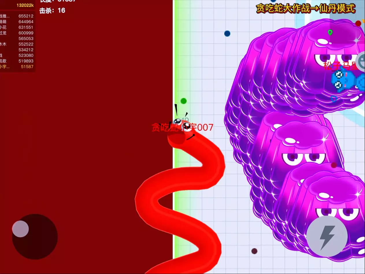 这是《贪吃蛇大作战》的仙丹模式游戏内容,该模式有万圣主题特效,玩家操控贪吃蛇游玩,初始长度可增加24,但作者不推荐玩这个模式。
