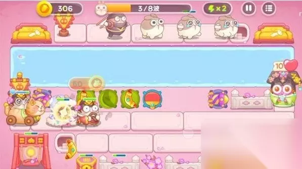 3、在第三波中,上面出口开始出现兔子,还可能出现飞的兔子。此时,中间的乒乓球拍和导弹塔会发挥作用。注意飞的兔子,一旦最下面的障碍物被清掉,迅速放置导弹塔和冰冻炮台以延缓大兔子的速度。