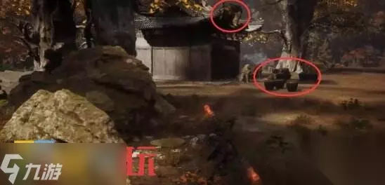 8.回到“千花谷”土地庙旁的桥,这回探索左边。过桥后左拐,打蛇妖得到【精魄】蛇司药。 走下图左边的坡上去,然后走过房顶,到高处开棺材得到【珍玩】日金乌。 然后走过下图正前方的门,来到“落花庄”土地庙。
