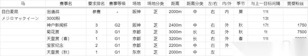 题外话: 这里要提一下麦昆的自身固有技能提升,一共有3次,判定条件为在第三年2月上(情人节)达到6万粉,在4月上(粉丝节?)9万粉,12月下(圣诞节)12万粉。LV4固有技能的麦昆发动后提速是肉眼可见的快。甚至能从5-6位跑个大差出来。 未验证:据说耐力消耗的需求是赛程的1/10,(加速开始后消耗翻倍),麦昆固有技能触发后消耗再翻倍。 这里正式开始 首先是因子搭配,优先选择长距离,草地,先行因子的,其次耐力和速度因子。 技能的话优先回复型技能>跑位技能(如垂れウマ回避等)>先行系技能, 其他大招的话,推荐铃鹿或者东海帝王的大,我原本想着用皇帝的,结果发现长跑麦昆后面很难有足够的人超,或者直接就被围着出不去了,皇帝技能可能不太适合后期, 因为没有米浴,感觉米浴也能用? 支援卡的话, 两张耐力卡必要,小海湾(上面借用好友的),剧情送的米浴,同期生的sr,这三张我觉得是一定要的,只有小海湾一个是自己没有的,其他不应该是没有的(没有可以借) 其他的配置一张速度一张智力卡(以有先行,回复,跑位技能优先,这次活动送的特别周也是可以) 标准开局,优先点个人多,然后去约会提下心情,回来继续哪里人多凑哪里热闹。直到同期生出来,点一次同期生拿心情和技能点。 出道赛后开始速耐对点,在有感叹号时候适当补下其他(除了有特殊事件,非关键技能的感叹号也不管),因为要准备打URA长距离,这时候中距离比赛要尽量少打,(麦昆剧情打4中2长,算上出道完了补粉丝1场,实际是5中2长,如果不额外打中距离,URA要打长需要打4场,这里推荐打有马,新闻杯前夏合宿结束有个长距离,打完休息打新闻杯,还有2场打完秋天皇开URA之前有两场OP级的进去虐菜,前提是粉丝够,不够就需要中途找长距离的打了) 3000粉丝目标完成之间有个1600粉丝的,支援卡几张25的就可以连同出道战完成只打这场就能达成3000粉,剩下的用来养成 最好触发了同期生约会,在需要的时候完成第一次约会(第二次必须留着,没体力没心情睡觉+逛街都不要用掉,要在7万5粉丝后用。选第二项可以获得6速和63点pt) 接下来的目标是神户新闻杯和菊花赏,因为菊花赏是长距,新闻杯是中,间隔回合只有1回合,中间还有个夏合宿,放在一起讲 在3000粉到神户新闻杯这期间,优先堆耐力,至少有2个回复系技能(不急着点,最好有圆弧那个金色的再加一个小技能),其他推荐这时候先点个速度型技能,以堆到体力450以上为及格线 其他属性以速度为主,力量和智力在夏天泳装的时候看人员和自身属性补些 应该神户新闻杯排位1着有点属性和技能跟不上,2着应该能确保的,菊花赏1位是稳的。 菊花赏结束后继续补耐力,按照都是25级支援卡这时候神户2菊花1位应该是3w粉丝,都是1位最好,预约到天皇赏春比赛中间的有马纪念(非常关键!,有3万粉,不打有马也行,要打好几个长距离比赛,在天皇赏之前把粉丝补到6w), 如果不想一直跑比赛,就一定要拿下有马(主堆耐力速度的话麦昆的有马挺简单的,耐力这时候要500+),至少我养失败的好几只有马都是1位。 这阶段的目标以拿下天皇赏春为目标,耐力最好堆到600,有3个以上回复技能可以适当缩减,有米浴的火事场力可以更低,其他用来堆速度,基本要求速度300+即可,剩下的可以补力量和智力,有跑位技能的话(最好2个)只补智力就可以 技能可以冲着长距离技能和泛用性技能了。也可以点米浴卡给的各种背刺技能 天皇赏也没什么问题,耐力够的话,这种养发的问题在与后面的两个中距离,宝塚記念和秋天皇赏,拿到春天皇后到宝塚記念时间只有3回合。如过春天皇拿了后粉丝不够9万,记得打这3回合中间的一个长距离比赛,有的话就不用补。 因为这时候的属性,跑中距离等于耐力是溢出的,所以看自己抉择了,如果想养中距离马,可能技能要补上,作为长距离的好处就是。秋天皇过了,URA就是进去虐菜的。 秋天皇过了后,URA开赛前还有两个长距离,跑了就进长距离URA,没有就是中距离 基本刚刚是9万粉的话,宝塚記念和秋天皇赏拿2和1,粉丝是够URA前面12万的, 4级固有的麦昆是真的发动了就是个怪物(前提是体力支撑得住,因为我自己很喜欢用铃鹿大,然后距离拉上去还有个铃鹿的大,这时候如果有末脚,你可以看到跑完了过了很久才陆续有马过来) 甚至有几把作为先行马,在刚到终盘的时候,就已经跑在逃马堆的前面了 养成中部分剧情触发选项效果如下,还有个看别人比赛的不知道另一个选项是啥效果 孤島の女王 食料 速度+10 体力 耐力+10 覚悟と使命の証 軽く走ろう 速度+10智力+10 お菓子でも食べよう 力量+20 レース場グルメの誘惑 一緒に食べよう 体力+30耐力+10技能Pt+10 我慢しよう 根性+15技能Pt+5 ラーメン3杯分の誘惑 安心しろ、体重管理はバッチリだ! 技能Pt+30 後でラーメン3杯分、走ろう!! * 銀幕の2人 "5時間インフェルノ" 耐力+10 "大脱獄" 智力+5技能Pt+15 栗祭り襲来! ちょっと控えよう 体力+10技能Pt+5 お腹いっぱい食べよう 体力+30,技能Pt+10,概率速度-5,力量+5,"太り気味"获得 夜中のファンサ特訓 い、今きたところ 根性+20 すごくよかったぞ 速度+20 その名はホヤ! 他の物も見てみよう 技能Pt+30 食すべき 耐力+10 思い出クッキング ゆっくり一緒に食べよう 体力+15 一気に飲み干す "先駆け"のヒントLv+1 ご令嬢の風格 かっこいいな、と思って 耐力+10,力量+10"練習上手"概率获得 隣に立つ努力をしないと、と思