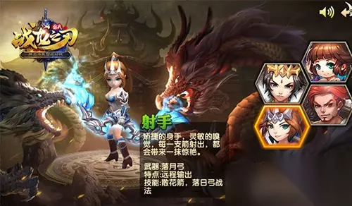 战龙之刃猛士 百人斩:快速挥动手中的大刀,短时间内攻击7次前方敌人,造成物理伤害。 突进:向敌人发起快速冲锋,向后推动敌人造成伤害。 裂地斩:转身一刀,对身前的敌人造成物理伤害,同时降低目标20%移动速度,减速持续3秒。 跃击:猛的一跳,落地对周围敌人造成物理伤害,并且将敌人击飞。 雷霆一击:双手握着大刀,跳起,像雷霆一般降临,对敌人造成物理伤害,降低60%移动速度,持续3秒。 挑衅怒吼:愤怒的咆哮,对周围敌人造成大量伤害,吸引周围的敌人来攻击自己,降低敌方60%的移动速度,同时增加自身20%的物理护甲,持续5秒。 战神斩:凝聚战神的力量,对前方敌人进行斩击,造成巨额物理伤害。 被动技能,增加生命值,增加物理护甲。(玄武甲,霸王之体,钢铁意志) 猛士的高输出,突进,控制性,高血,高物理护甲使其在前期发展非常迅猛,也是适合平民玩家的选择。? 【射手】 形象上看,射手怎么也应该是气质型的御姐,但是后面你会发现,其实她还带有点女汉子的味道啊。射手是物理远程职业,也是一个脆皮,需要有前排保护,本身灵动性也是很强的。