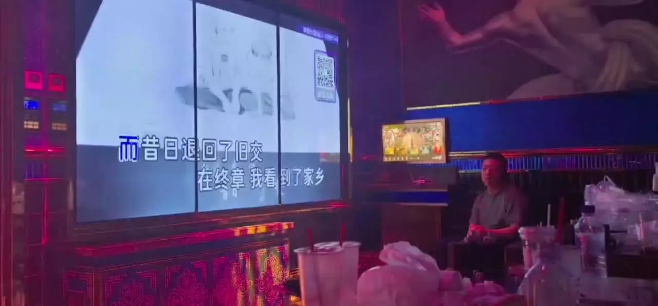 发帖人歌瘾发作,大半夜独自前往KTV演唱歌曲《鸳鸯债》,借歌词抒发自身失去心中爱人的怅惘情绪,图中展示了此次K歌时KTV屏幕的歌词与画面。